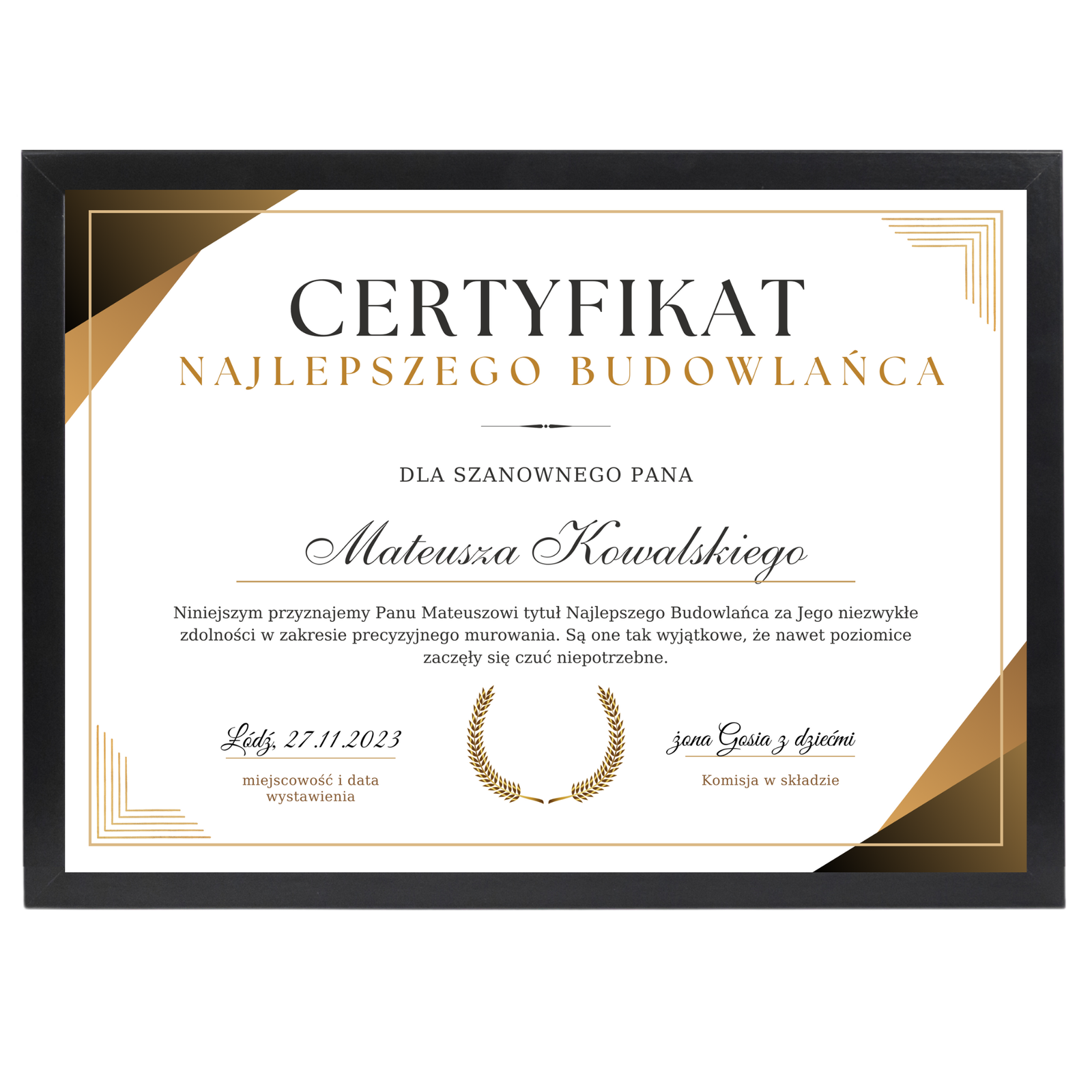 Certyfikat dla Budowlańca – Najlepszy Budowlaniec – personalizowany, w solidnej ramie ze szkłem
