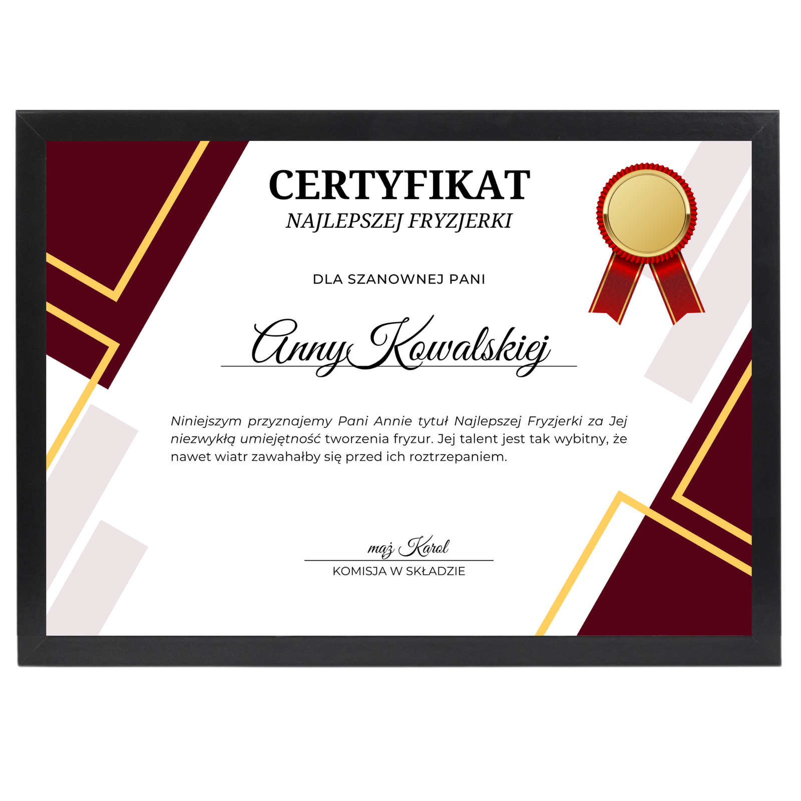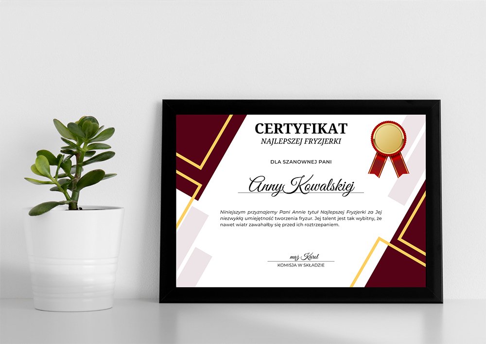 Certyfikat dla Fryzjerki – Najlepsza Fryzjerka – personalizowany, w solidnej ramie ze szkłem