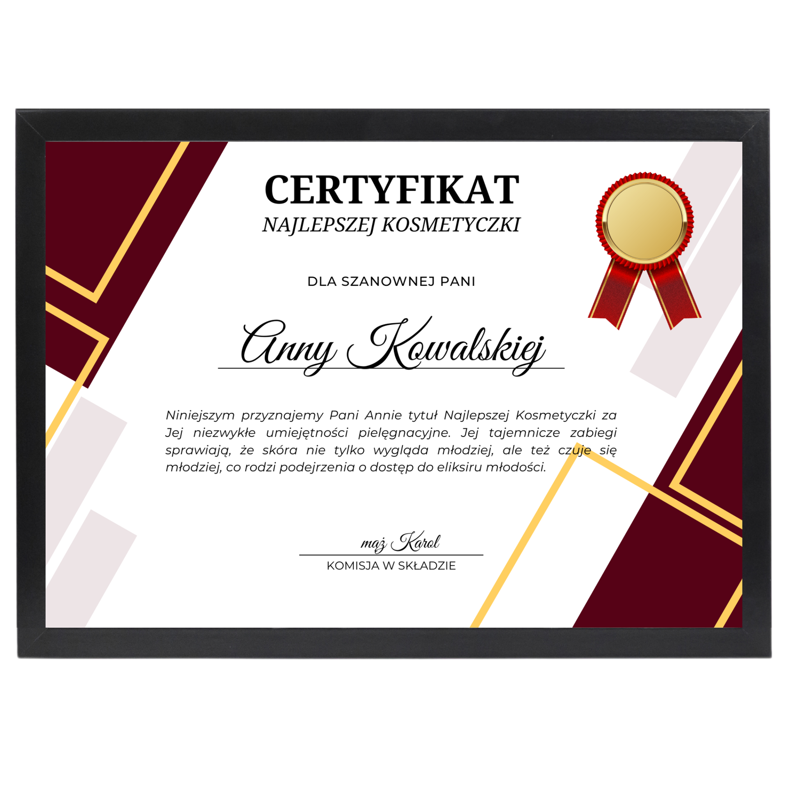 Certyfikat dla Kosmetyczki – Najlepsza Kosmetyczka to elegancki i oryginalny prezent na uczczenie wyjątkowej chwili dla wyjątkowej osoby. To personalizowany certyfikat, umieszczony w solidnej, czarnej ramie ze szkłem. Dzięki personalizacji zyskuje unikalny charakter – dodaj Wasze imię i nazwisko, datę, miejscowość, dedykację lub dowolny tekst, to sprawi, że certyfikat stanie się wyjątkową pamiątką na lata.