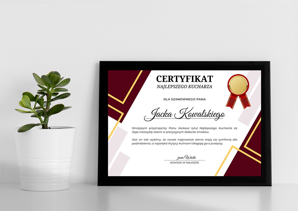 Certyfikat dla Kucharza – Najlepszy Kucharz to elegancki i oryginalny prezent na uczczenie wyjątkowej chwili dla wyjątkowej osoby. To personalizowany certyfikat, umieszczony w solidnej, czarnej ramie ze szkłem. Dzięki personalizacji zyskuje unikalny charakter – dodaj Wasze imię i nazwisko, datę, miejscowość, dedykację lub dowolny tekst, to sprawi, że certyfikat stanie się wyjątkową pamiątką na lata.
