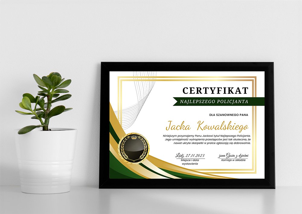 Certyfikat dla Policjanta – Najlepszy Policjant to elegancki i oryginalny prezent na uczczenie wyjątkowej chwili dla wyjątkowej osoby. To personalizowany certyfikat, umieszczony w solidnej, czarnej ramie ze szkłem. Dzięki personalizacji zyskuje unikalny charakter – dodaj Wasze imię i nazwisko, datę, miejscowość, dedykację lub dowolny tekst, to sprawi, że certyfikat stanie się wyjątkową pamiątką na lata.