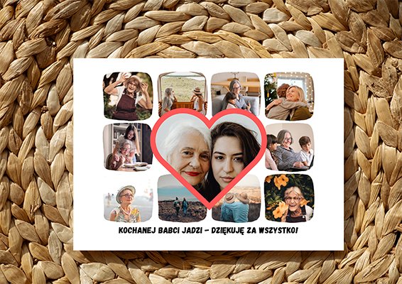 Kolaż na Dzień Babci – Dziękuję za wszystko! to personalizowany kolaż zdjęć – tworzony z myślą o ważnych chwilach i bliskich osobach. Możesz wybrać zdjęcia, dodać dedykację lub datę, aby stworzyć jedyną w swoim rodzaju kompozycję. To nie tylko dekoracja, ale też piękna historia zamknięta w kadrach. Połączenie estetyki, intensywnych kolorów i wysokiej jakości druku sprawia, że kolaż stanie się wyjątkową ozdobą wnętrza i pamiątką na długie lata.