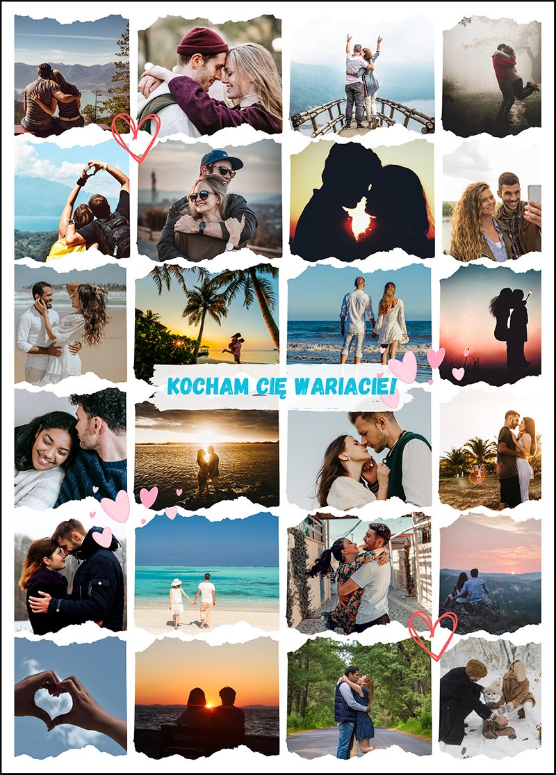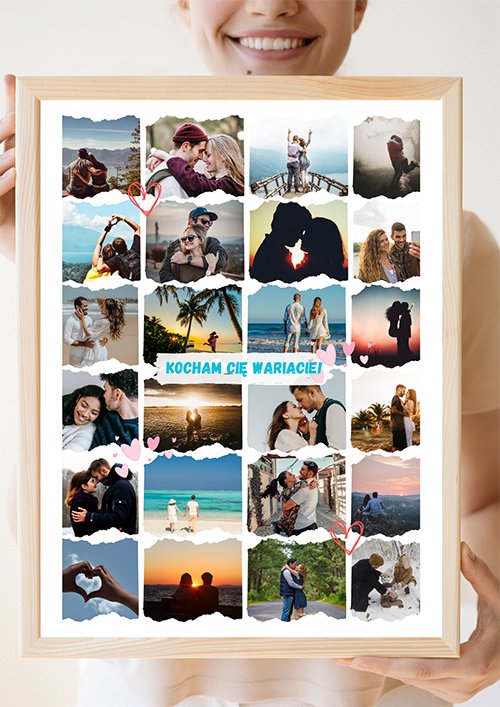 Kolaż zdjęć dla Niego – Kocham Cię Wariacie! to personalizowany kolaż zdjęć – tworzony z myślą o ważnych chwilach i bliskich osobach. Możesz wybrać zdjęcia, dodać dedykację lub datę, aby stworzyć jedyną w swoim rodzaju kompozycję. To nie tylko dekoracja, ale też piękna historia zamknięta w kadrach. Połączenie estetyki, intensywnych kolorów i wysokiej jakości druku sprawia, że kolaż stanie się wyjątkową ozdobą wnętrza i pamiątką na długie lata.