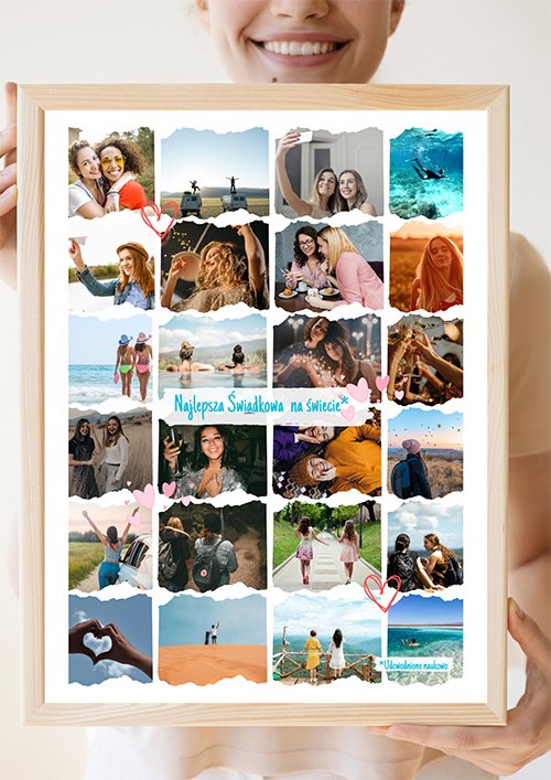 Kolaż zdjęć dla Świadkowej – Najlepsza Świadkowa na świecie to personalizowany kolaż zdjęć – tworzony z myślą o ważnych chwilach i bliskich osobach. Możesz wybrać zdjęcia, dodać dedykację lub datę, aby stworzyć jedyną w swoim rodzaju kompozycję. To nie tylko dekoracja, ale też piękna historia zamknięta w kadrach. Połączenie estetyki, intensywnych kolorów i wysokiej jakości druku sprawia, że kolaż stanie się wyjątkową ozdobą wnętrza i pamiątką na długie lata.