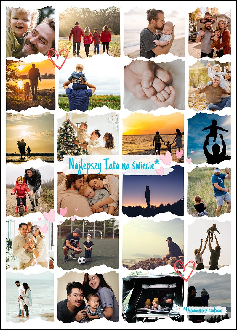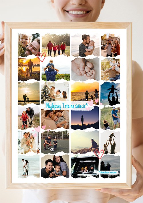 Kolaż zdjęć dla Taty – Najlepszy Tata na świecie to personalizowany kolaż zdjęć – tworzony z myślą o ważnych chwilach i bliskich osobach. Możesz wybrać zdjęcia, dodać dedykację lub datę, aby stworzyć jedyną w swoim rodzaju kompozycję. To nie tylko dekoracja, ale też piękna historia zamknięta w kadrach. Połączenie estetyki, intensywnych kolorów i wysokiej jakości druku sprawia, że kolaż stanie się wyjątkową ozdobą wnętrza i pamiątką na długie lata.