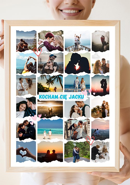 Kolaż zdjęć dla Ukochanego – Kocham Cię to personalizowany kolaż zdjęć – tworzony z myślą o ważnych chwilach i bliskich osobach. Możesz wybrać zdjęcia, dodać dedykację lub datę, aby stworzyć jedyną w swoim rodzaju kompozycję. To nie tylko dekoracja, ale też piękna historia zamknięta w kadrach. Połączenie estetyki, intensywnych kolorów i wysokiej jakości druku sprawia, że kolaż stanie się wyjątkową ozdobą wnętrza i pamiątką na długie lata.