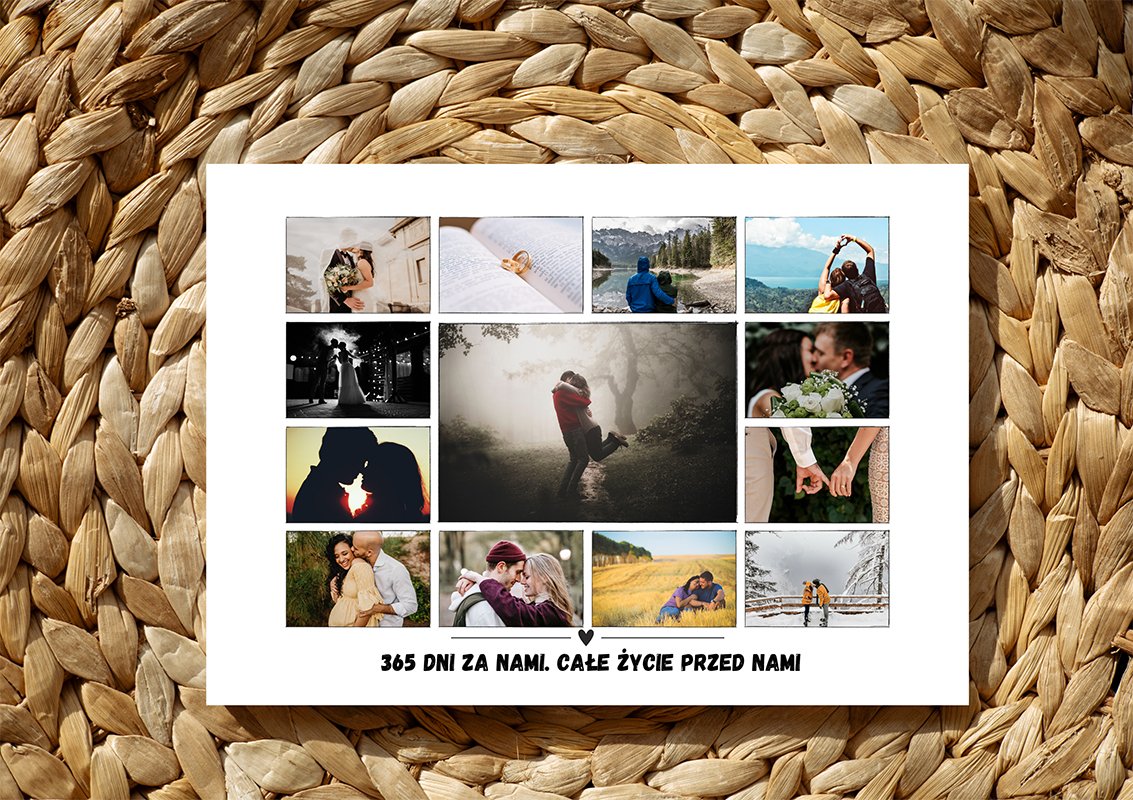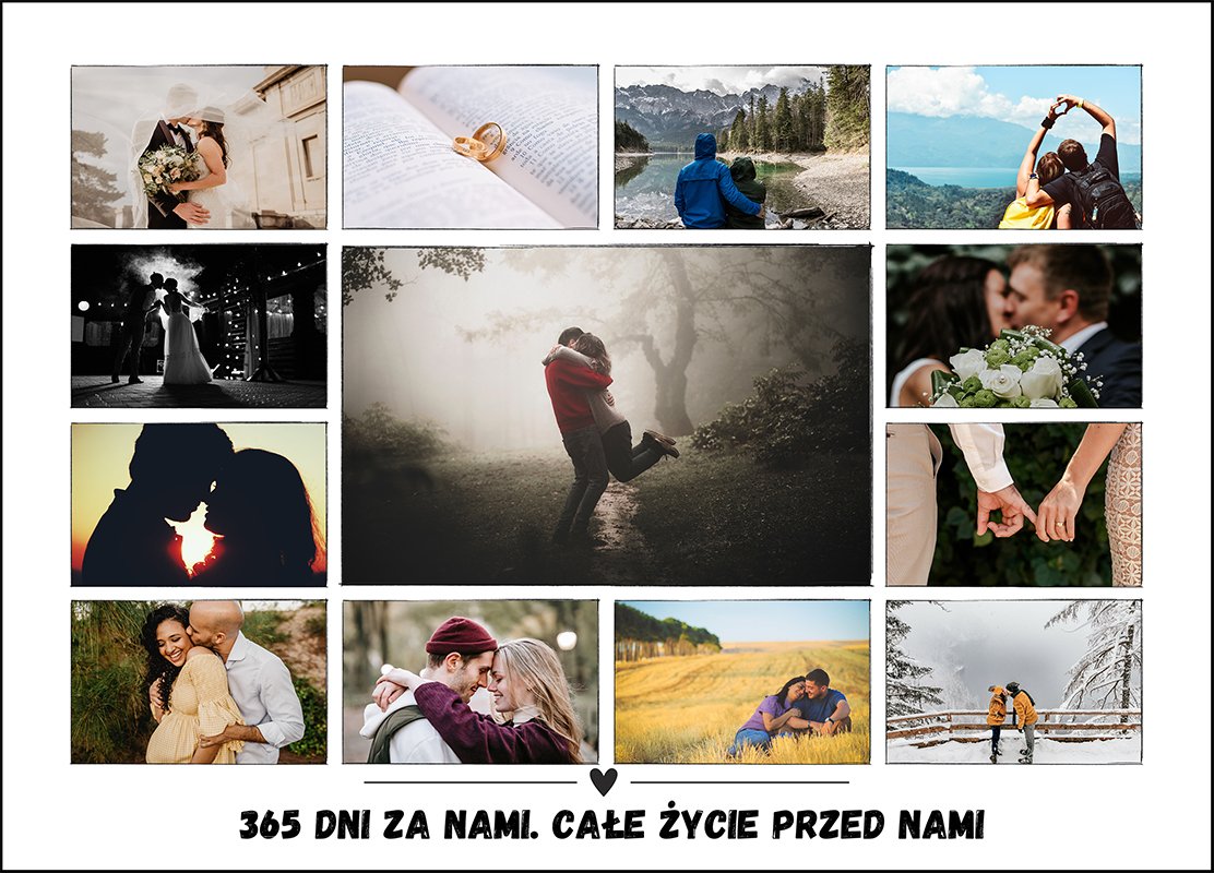 Kolaż zdjęć na rocznicę ślubu – 365 dni za nami, całe życie przed nami to dekoracja i prezent, który mówi więcej niż tysiąc słów. Nasze kolaże zdjęć to nie tylko zacne dekoracje, ale też opowieści zapisane w kadrach.