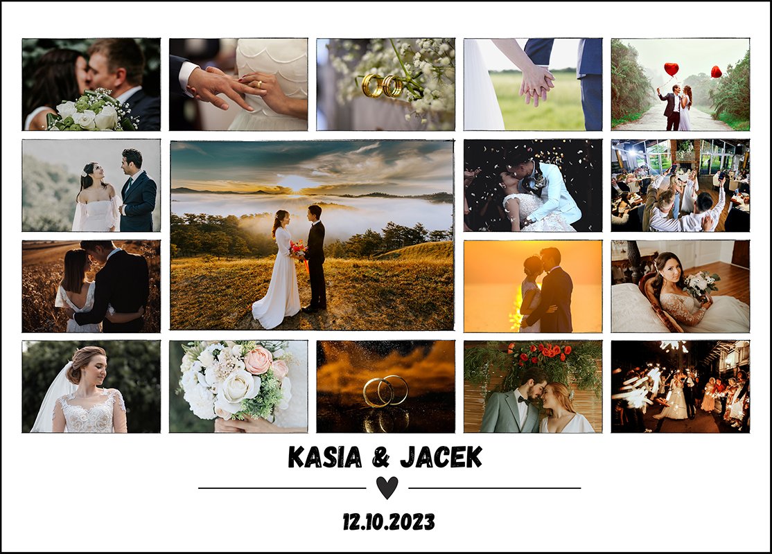 Kolaż zdjęć ślubnych – Imiona + Data Ślubu to dekoracja i prezent, który mówi więcej niż tysiąc słów. Nasze kolaże zdjęć to nie tylko zacne dekoracje, ale też opowieści zapisane w kadrach.