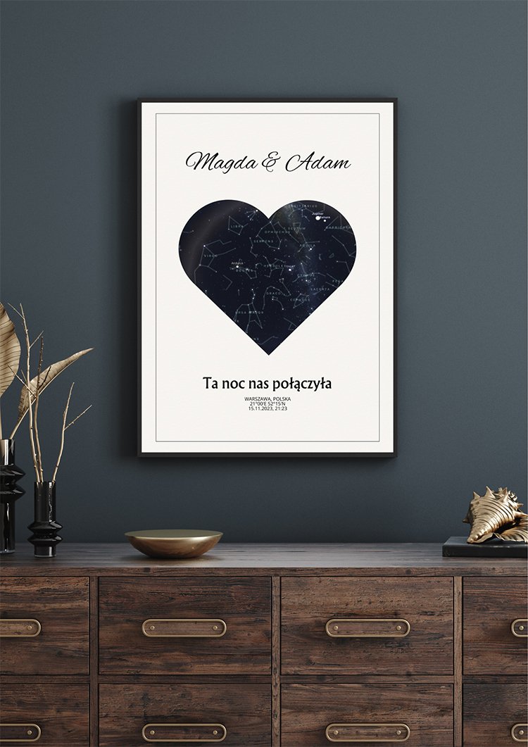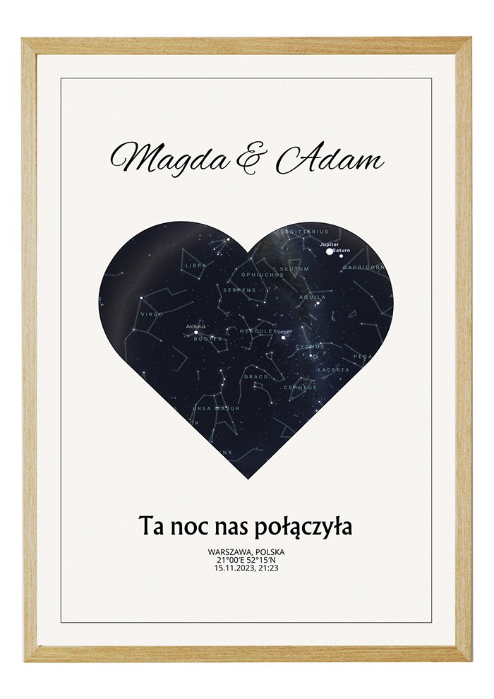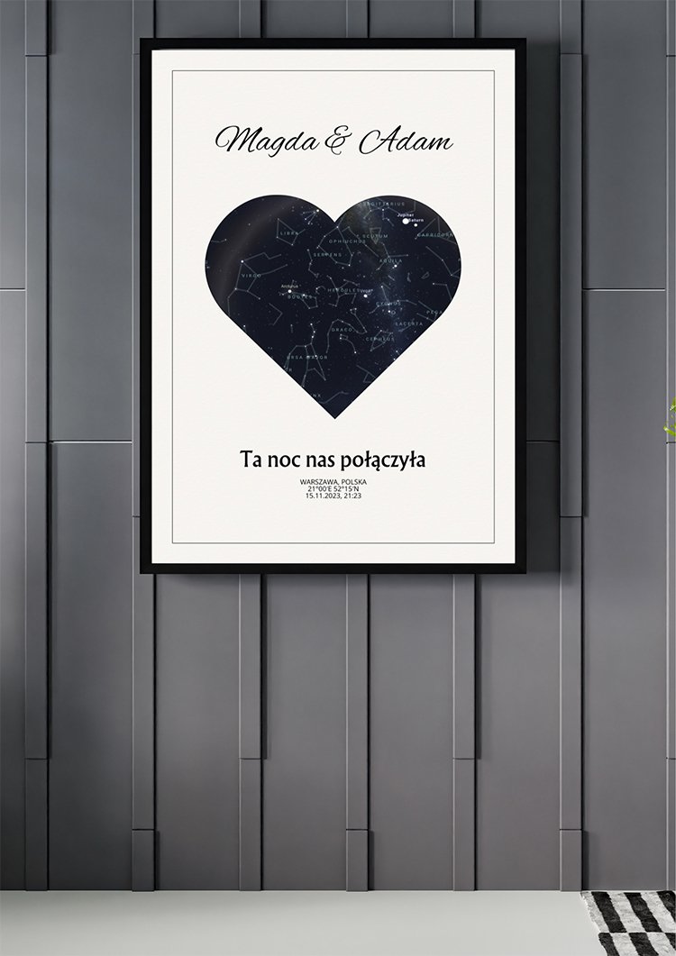 Mapa Gwiazd Prezent – Serce to personalizowana mapa – tworzona z myślą o konkretnej osobie i chwili. Dodaj dedykację, imiona, datę, współrzędne lub ważne miejsce, a otrzymasz unikatowy prezent, który stanie się cudowną pamiątką na lata. Połączenie estetyki i trwałych materiałów sprawia, że mapa pięknie zaprezentuje się w każdym wnętrzu i będzie długo cieszyć oko.
