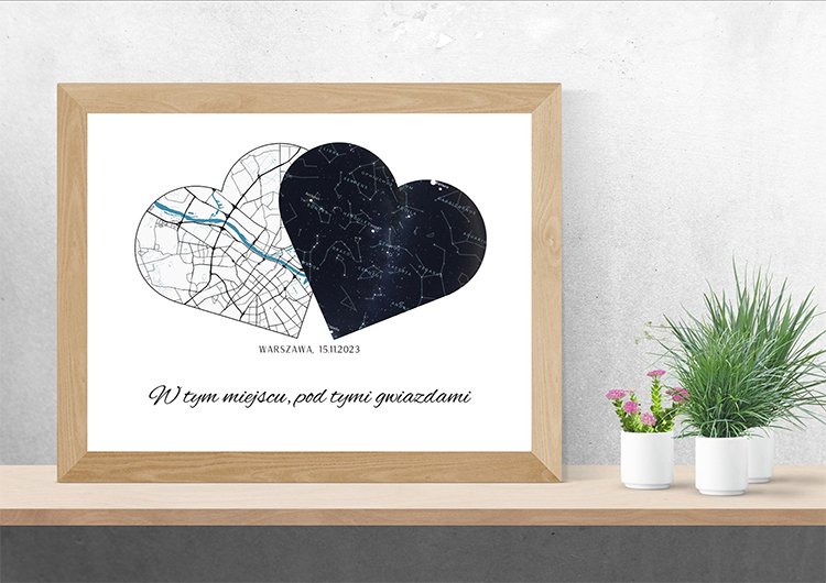 Nasze Pierwsze Spotkanie: Mapa Miasta i Mapa Gwiazd to personalizowana mapa – tworzona z myślą o konkretnej osobie i chwili. Dodaj dedykację, imiona, datę, współrzędne lub ważne miejsce, a otrzymasz unikatowy prezent, który stanie się cudowną pamiątką na lata. Połączenie estetyki i trwałych materiałów sprawia, że mapa pięknie zaprezentuje się w każdym wnętrzu i będzie długo cieszyć oko.