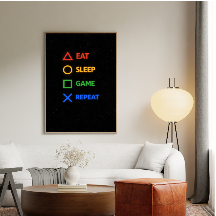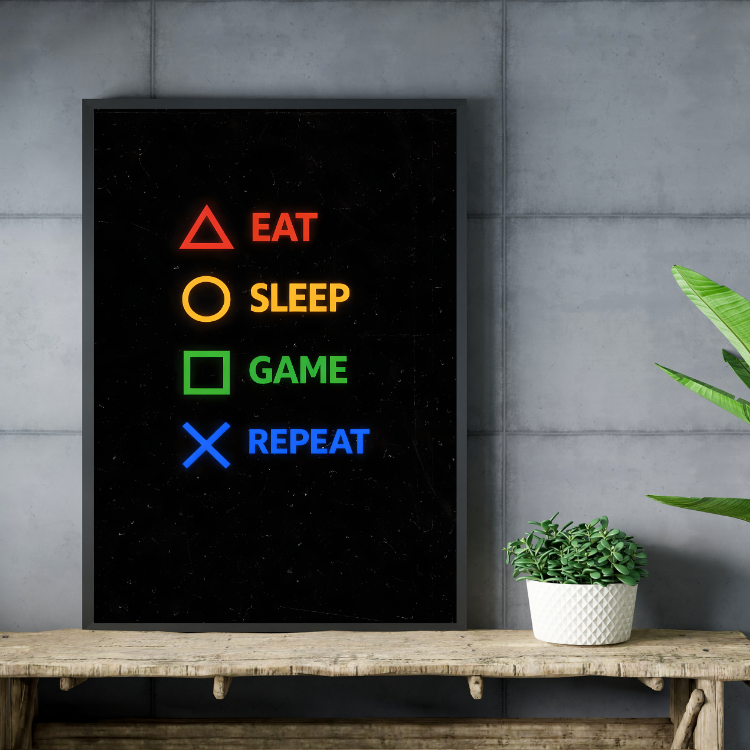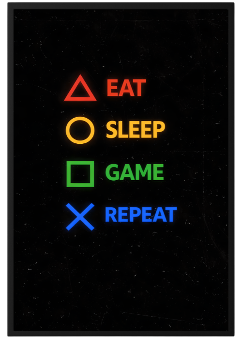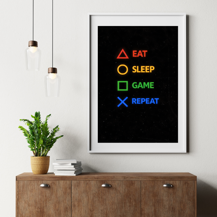 Plakat Eat Sleep Game to ciekawa dekoracja ścienna, która świetnie sprawdzi się jako ozdoba do Twojego domu lub jako oryginalny prezent. Łatwy do oprawienia, dostępny w popularnych rozmiarach.