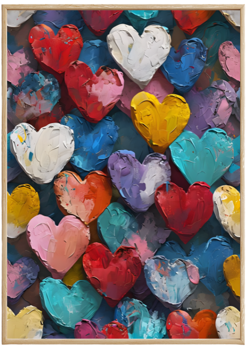 Plakat Kolorowe Serca to ciekawa dekoracja ścienna, która świetnie sprawdzi się jako ozdoba do Twojego domu lub jako oryginalny prezent. Łatwy do oprawienia, dostępny w popularnych rozmiarach.