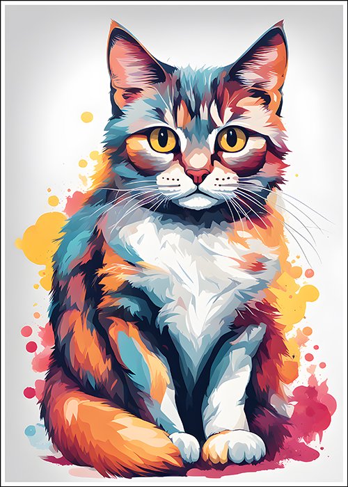 Plakat Kolorowy Kotek to ciekawa dekoracja ścienna, która świetnie sprawdzi się jako ozdoba do Twojego domu lub jako oryginalny prezent. Łatwy do oprawienia, dostępny w popularnych rozmiarach.