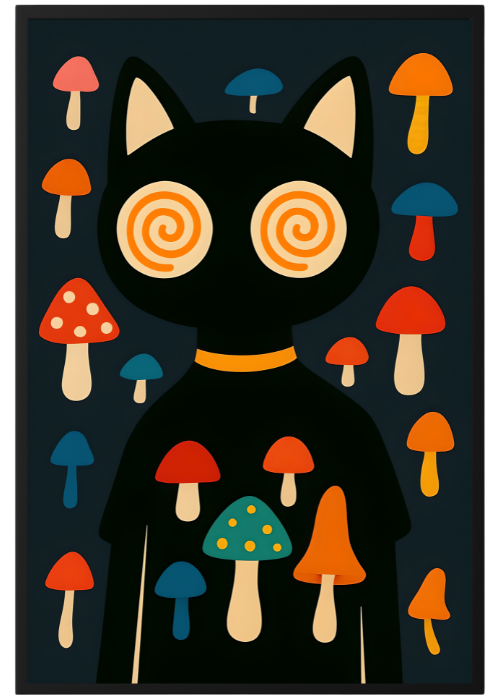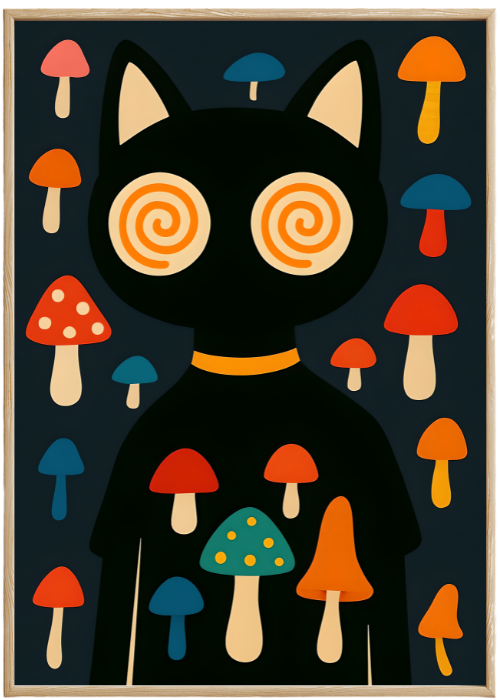 Plakat Kot Na Grzybach to ciekawa dekoracja ścienna, która świetnie sprawdzi się jako ozdoba do Twojego domu lub jako oryginalny prezent. Łatwy do oprawienia, dostępny w popularnych rozmiarach.