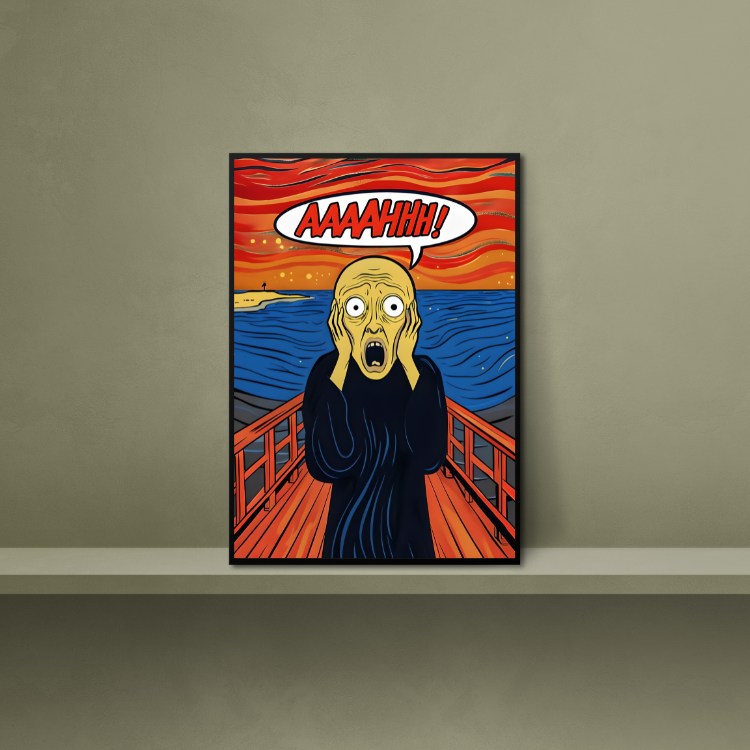 Plakat Krzyk Parodia to ciekawa dekoracja ścienna, która świetnie sprawdzi się jako ozdoba do Twojego domu lub jako oryginalny prezent. Łatwy do oprawienia, dostępny w popularnych rozmiarach.