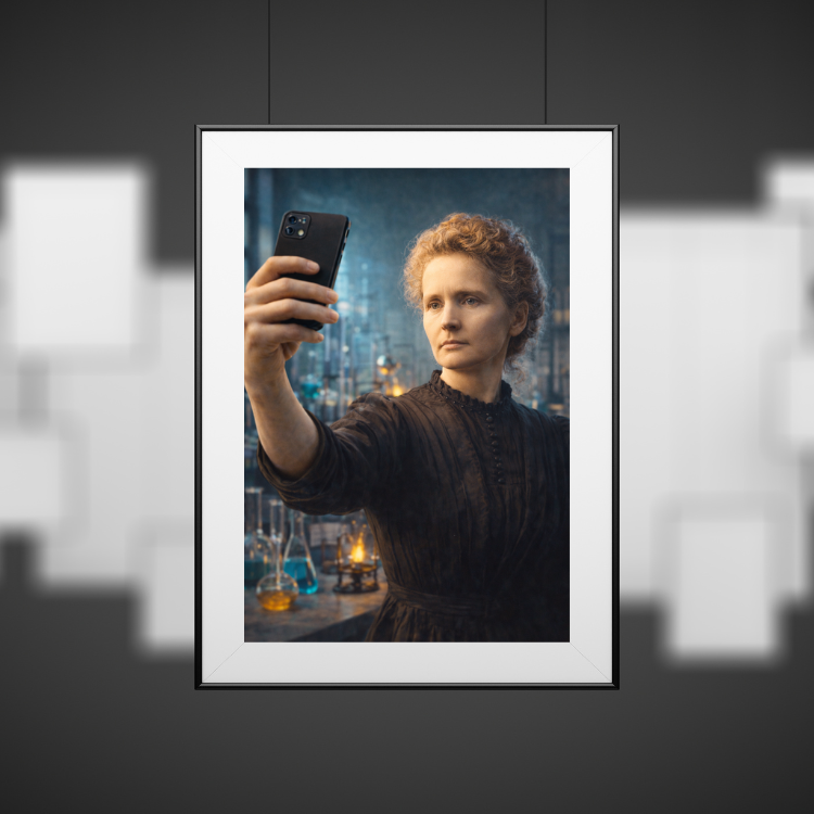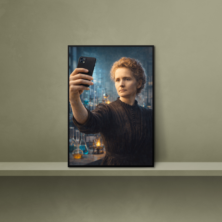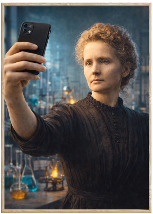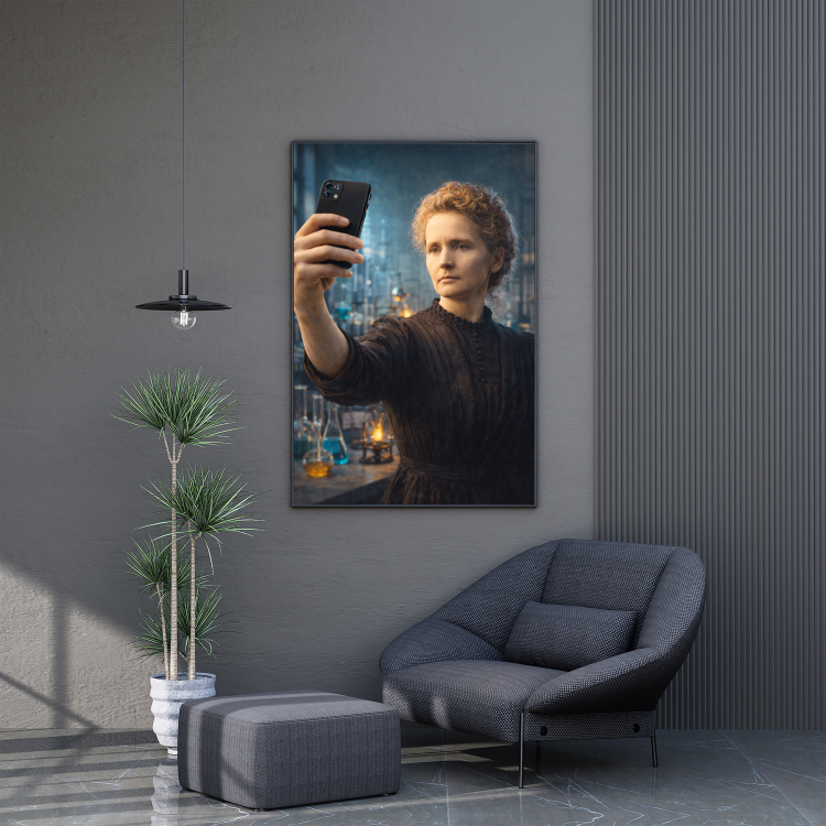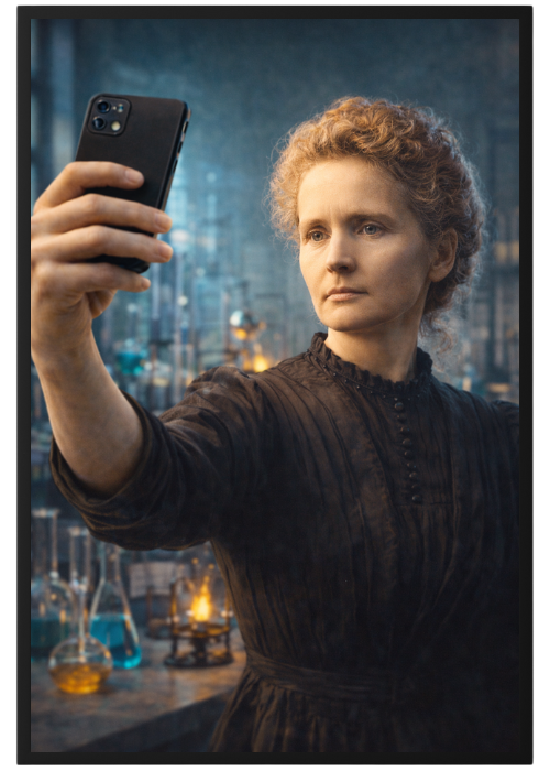 Plakat Maria Curie Selfie to ciekawa dekoracja ścienna, która świetnie sprawdzi się jako ozdoba do Twojego domu lub jako oryginalny prezent. Łatwy do oprawienia, dostępny w popularnych rozmiarach.