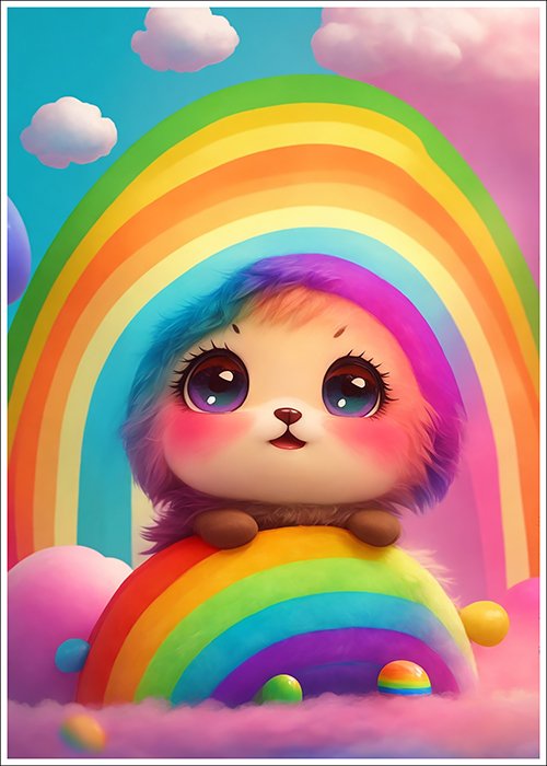 Plakat Misio i tęcza to ciekawa dekoracja ścienna, która świetnie sprawdzi się jako ozdoba do Twojego domu lub jako oryginalny prezent. Łatwy do oprawienia, dostępny w popularnych rozmiarach.