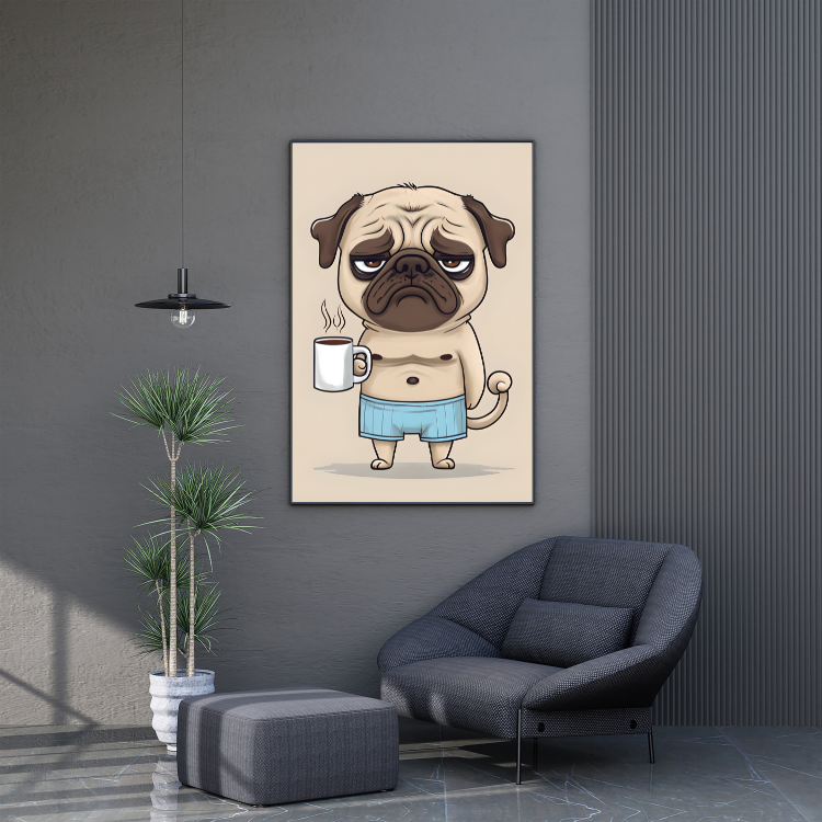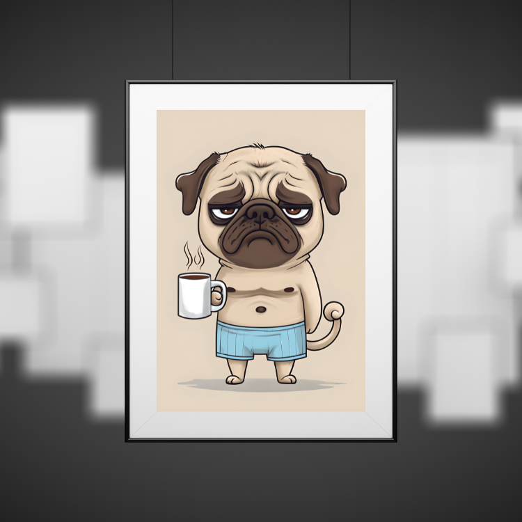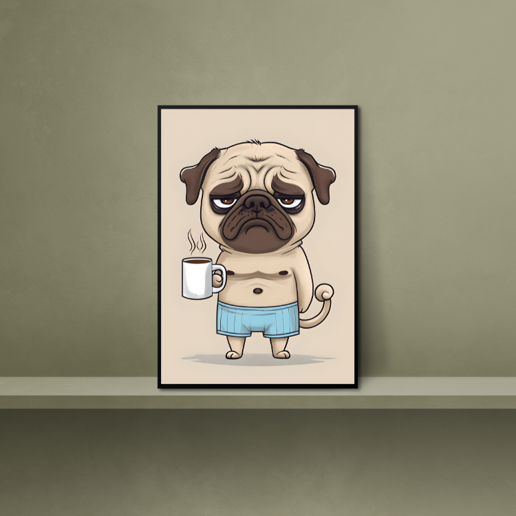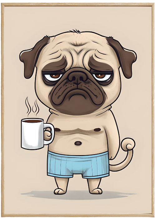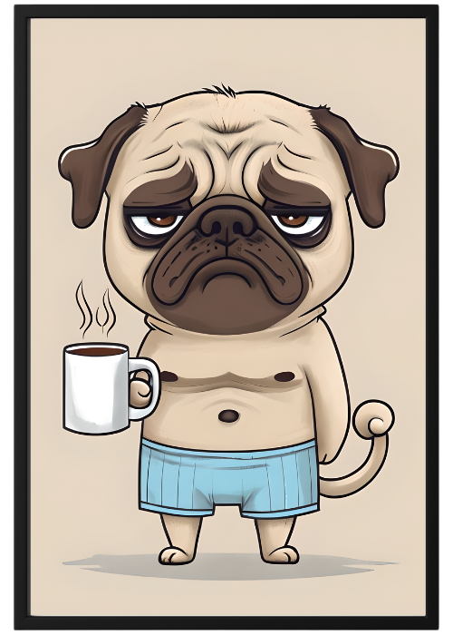 Plakat Mops Z Kawą – Z grafiką, Grafika, Nowoczesny, Humor, Papier plakatowy, Wykończenie matowe, Bez ramy