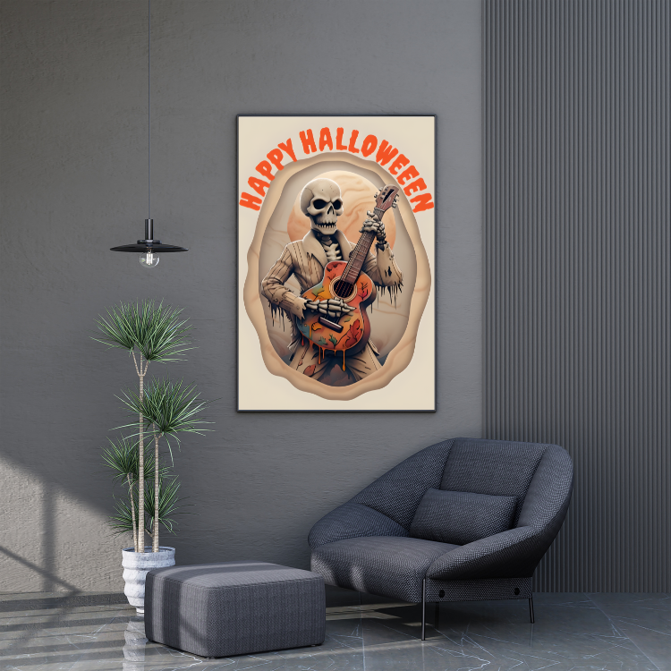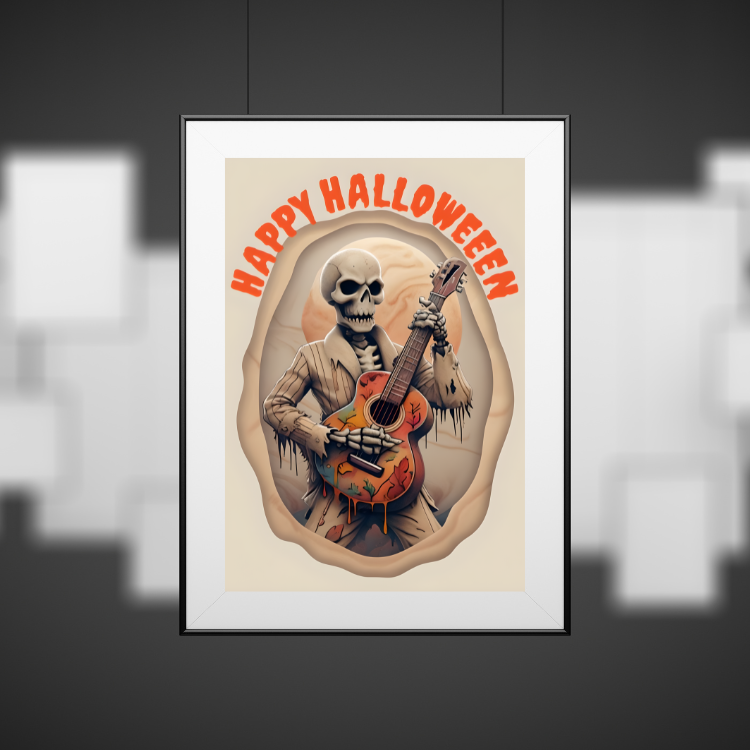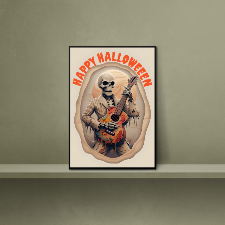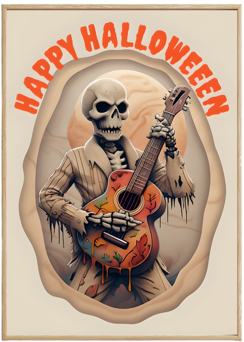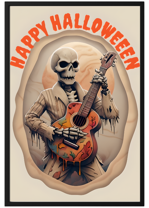 Plakat Szkielet Z Gitarą to ciekawa dekoracja ścienna, która świetnie sprawdzi się jako ozdoba do Twojego domu lub jako oryginalny prezent. Łatwy do oprawienia, dostępny w popularnych rozmiarach.