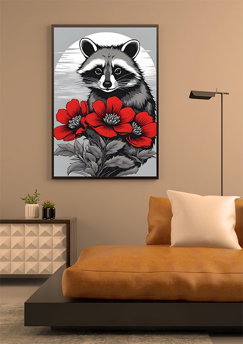 Plakat Szop z kwiatami to ciekawa dekoracja ścienna, która świetnie sprawdzi się jako ozdoba do Twojego domu lub jako oryginalny prezent. Łatwy do oprawienia, dostępny w popularnych rozmiarach.