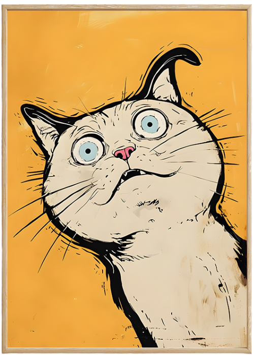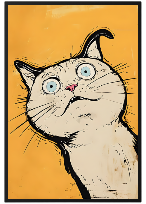 Plakat Zaskoczony Kot to ciekawa dekoracja ścienna, która świetnie sprawdzi się jako ozdoba do Twojego domu lub jako oryginalny prezent. Łatwy do oprawienia, dostępny w popularnych rozmiarach.